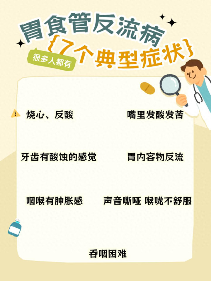 食管期(典型症状):烧心(胸骨后灼烧感)、嗳酸(胃内容物上涌),常在餐后、横卧或弯腰时加剧。