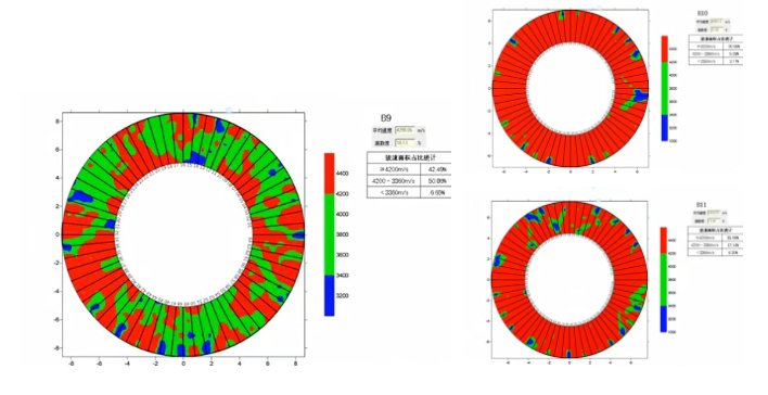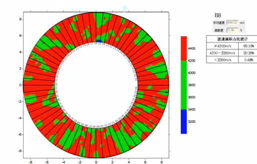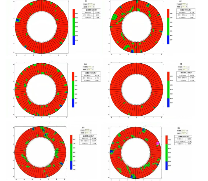 塔筒混凝土的CT切片收尾图中红色暗意强度达到筹划要求,绿色暗意未达到筹划要求,蓝色属于残障畛域。