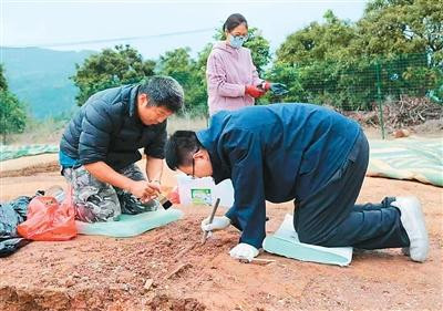 不久前,张旭(右一)在福建福州毒头山考古名胜现场计帐并索求古代东说念主类骨骼。张旭供图