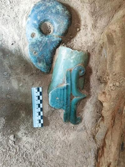 元宝山积石冢名胜随葬玉器出土现场。(尊府相片)新华社发