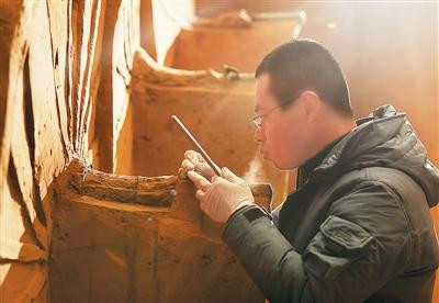 陕西省考古计议院寨沟名胜考古队队员于有光在陕西清涧瓦窑沟坟场M8号墓葬计帐车马器。新华社发