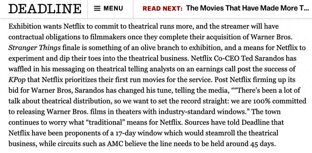 [环球网科技轮廓报说念]1月3日音书,据Deadline报说念,Netflix在完成对华纳昆玉的收购后,计算将华纳昆玉电影的院线放映窗口期大幅裁减至17天。
