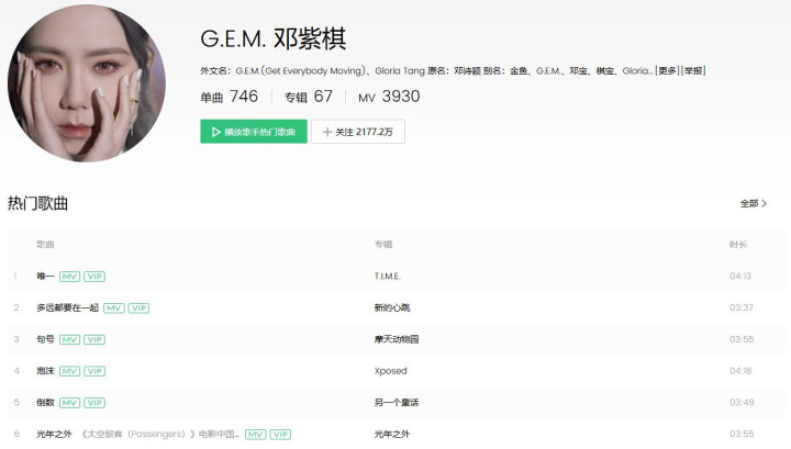 在榜单前三十名中,女歌手仅占三席:邓紫棋(第3名,1,766,772)、单依纯(第19名,322,916)、鞠婧祎(第24名,283,988)。